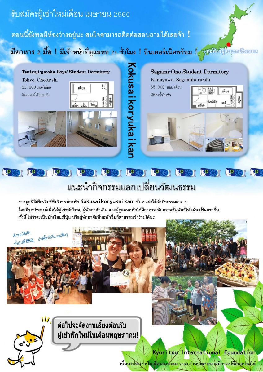 รับสมัครผู้เช่าใหม่เดือน เมษายน 2560 หอพัก Kokusaikoryukaikan